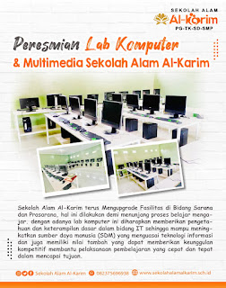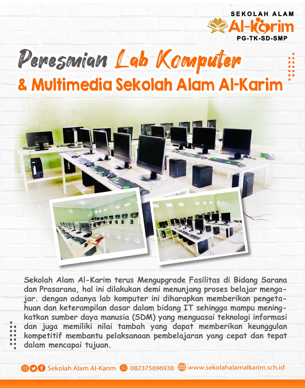 Sekolah Alam Al-Karim terus Mengupgrade Fasilitas di Bidang Sarana dan Prasarana, hal ini dilakukan demi menunjang proses belajar mengajar. dengan adanya lab komputer ini diharapkan memberikan pengetahuan dan keterampilan dasar dalam bidang IT sehingga mampu meningkatkan sumber daya manusia (SDM) yang menguasai teknologi informasi dan juga memiliki nilai tambah yang dapat memberikan keunggulan kompetitif membantu pelaksanaan pembelajaran yang cepat dan tepat dalam mencapai tujuan.